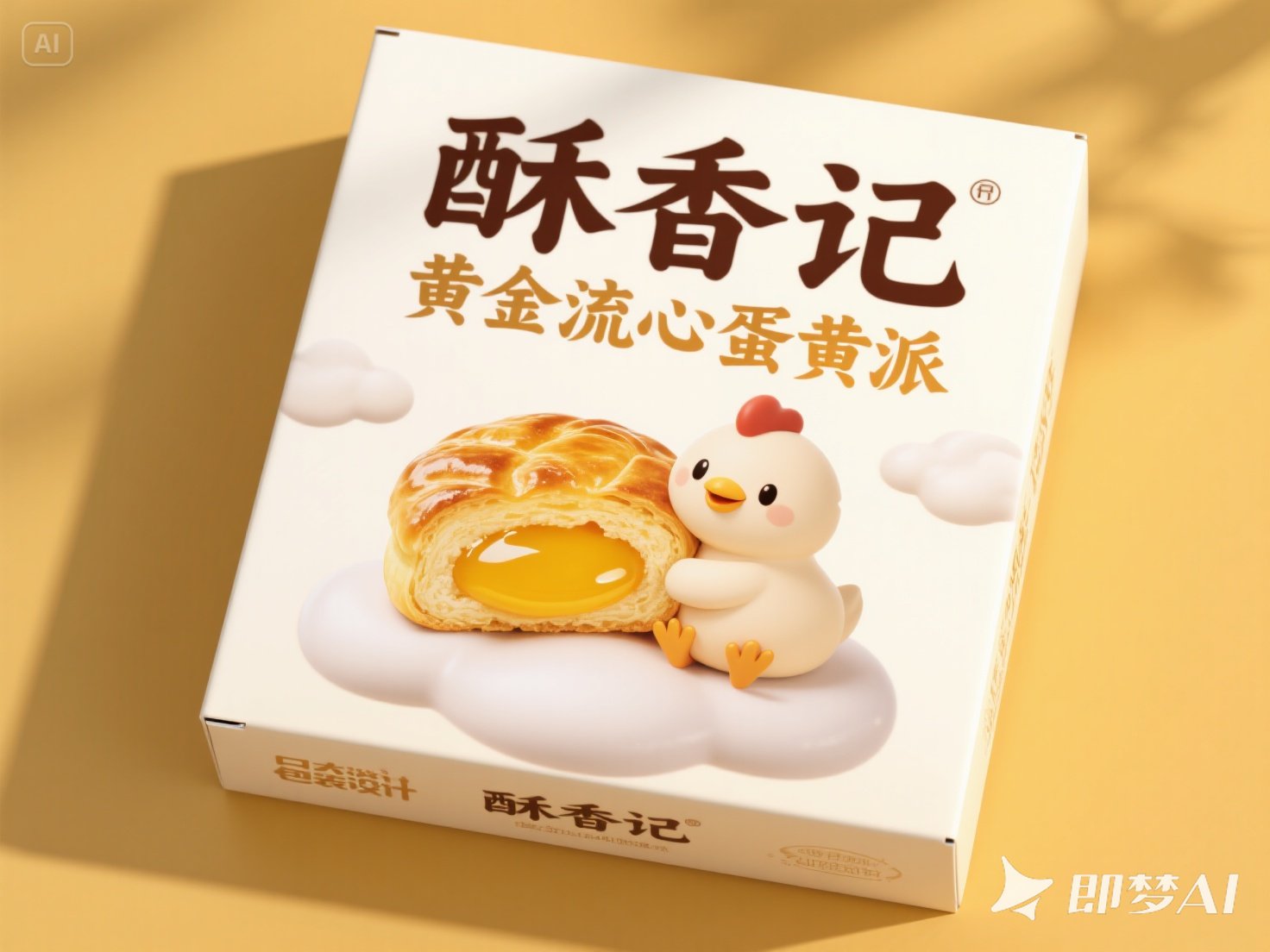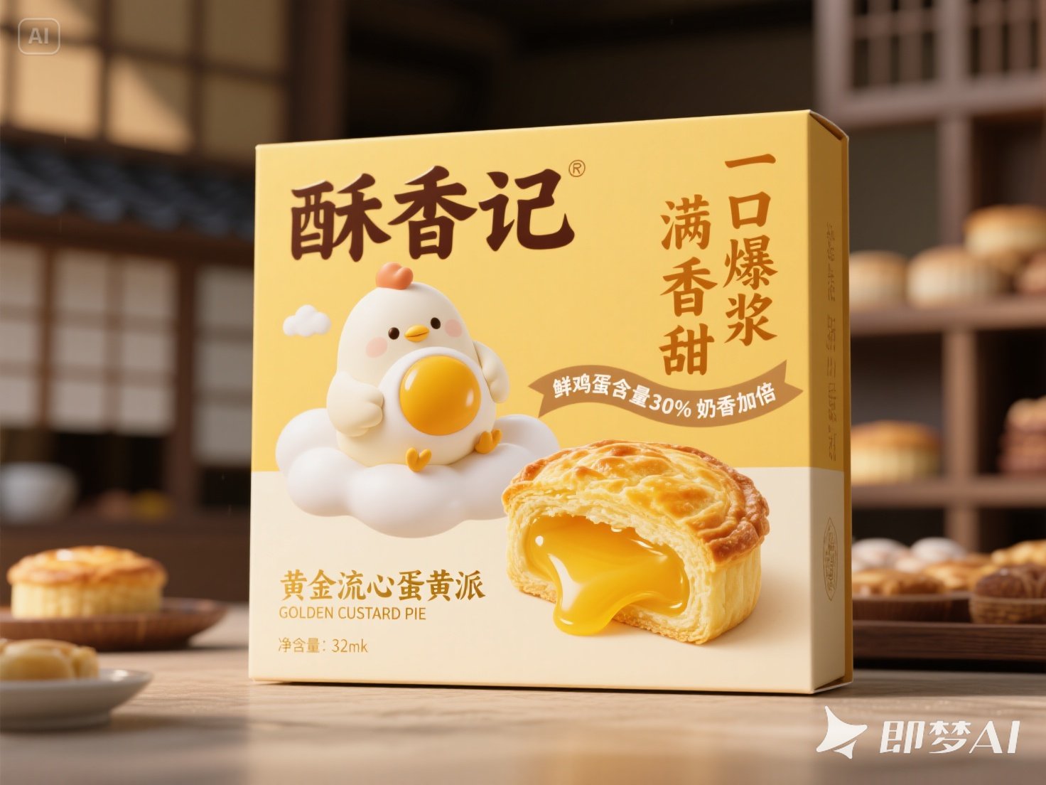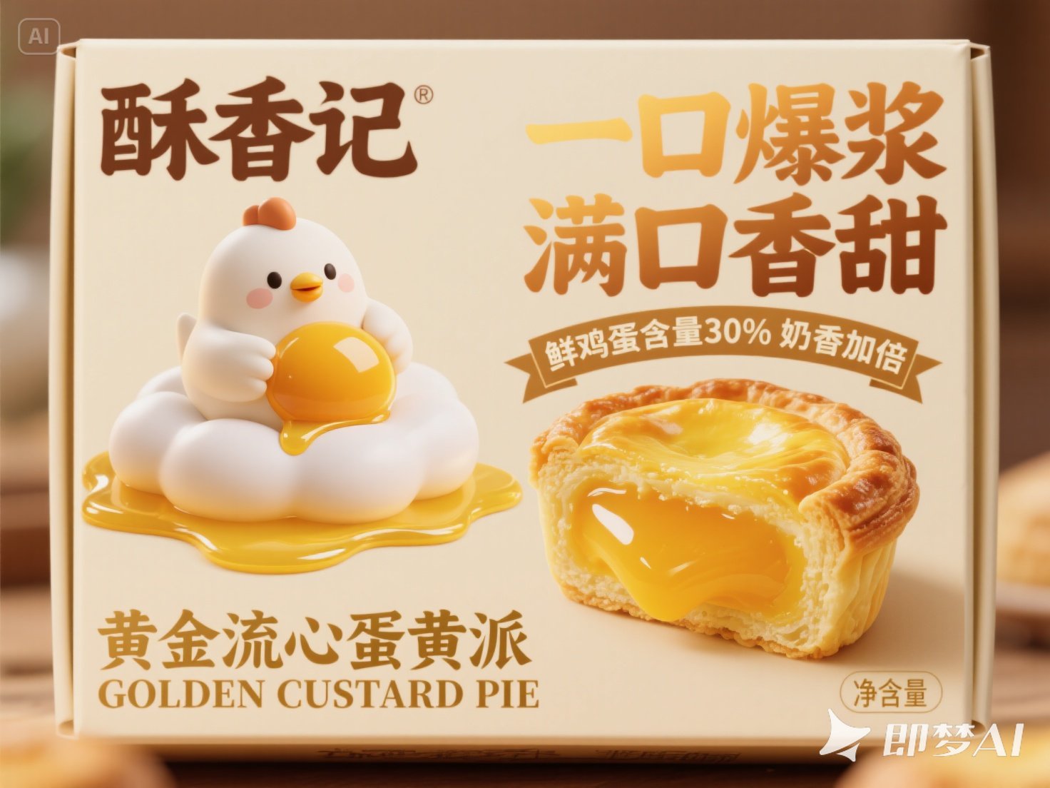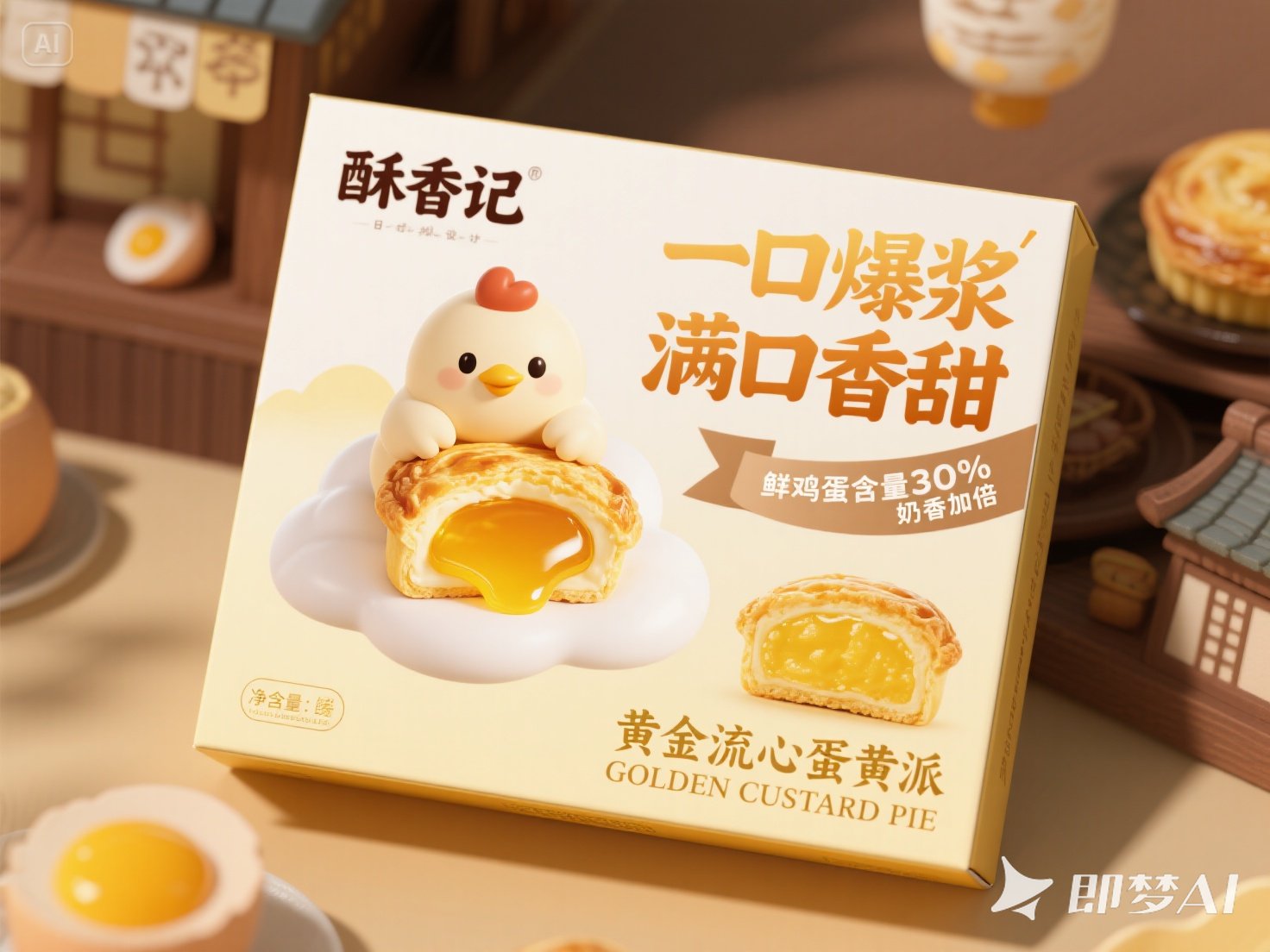 蛋黄派包装设计。主色调:暖黄色/奶油白/金咖色 左上方角落:深褐色浮雕楷体logo"酥香记",字体圆润带流动感 视觉中心:萌趣小鸡怀抱蛋黄派坐云朵上的卡通形象,蛋黄流淌出金色流心效果 右侧竖版广告语:"一口爆浆 满口香甜"(琥珀色渐变立体字) 中部飘带标语:"鲜鸡蛋含量30% 奶香加倍"(浅咖色衬线体) 下方奶油色区域:展示金黄流心切面特写,表层酥皮细节清晰可见 底部:隶书"黄金流心蛋黄派"+英文"GOLDEN CUSTARD PIE" 边角信息:净含量标注于左下,采用烫金小字 设计风格:日式点心铺质感,哑光材质纹理,全景视角,3D光影层次,32k渲染,以效果图形式展示